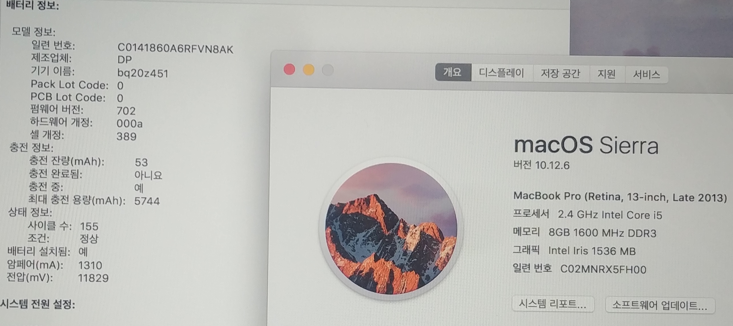 배터리 사이클 155  최대충전용량 5744