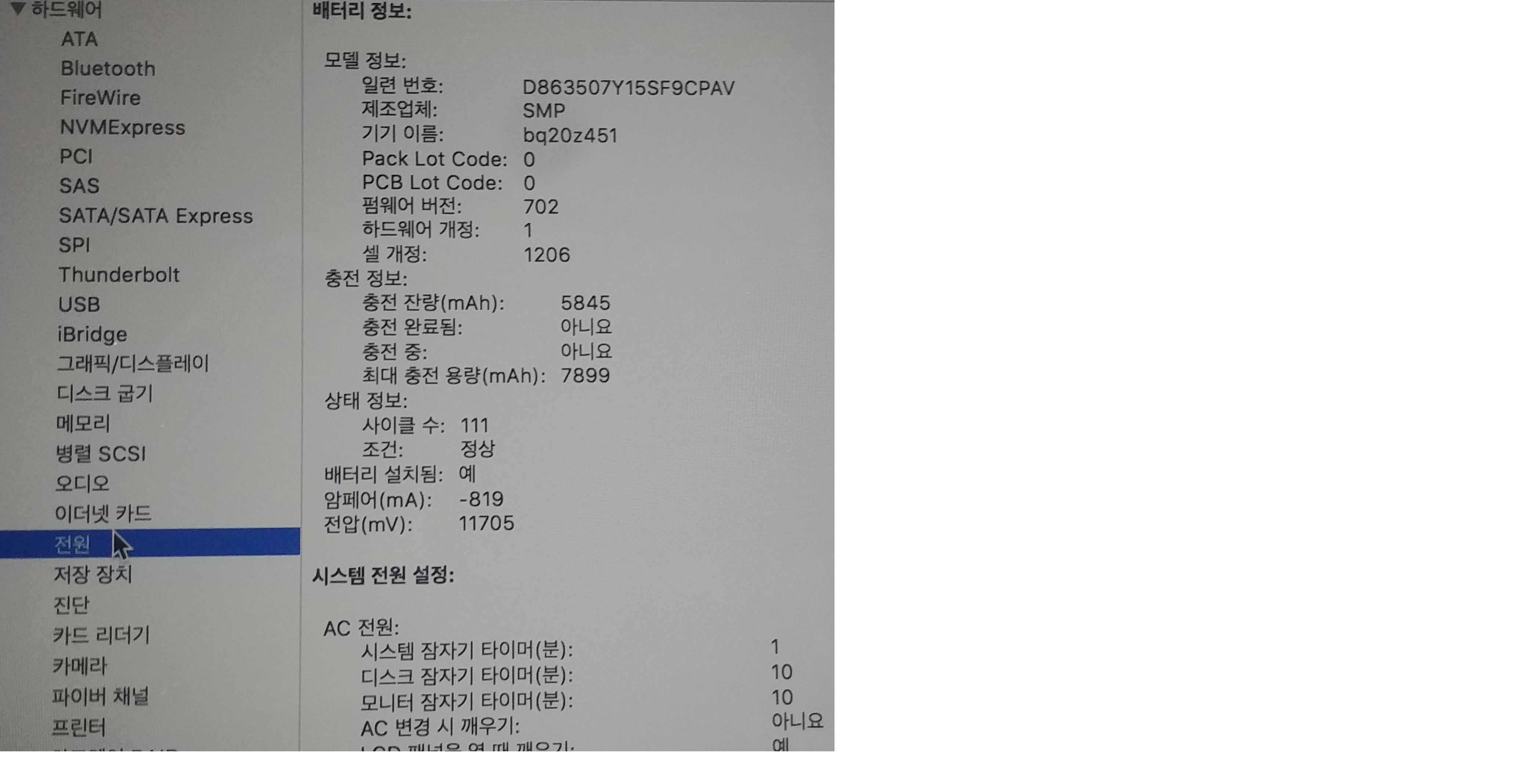 배터리 사이클 111  최대충전용량 7899