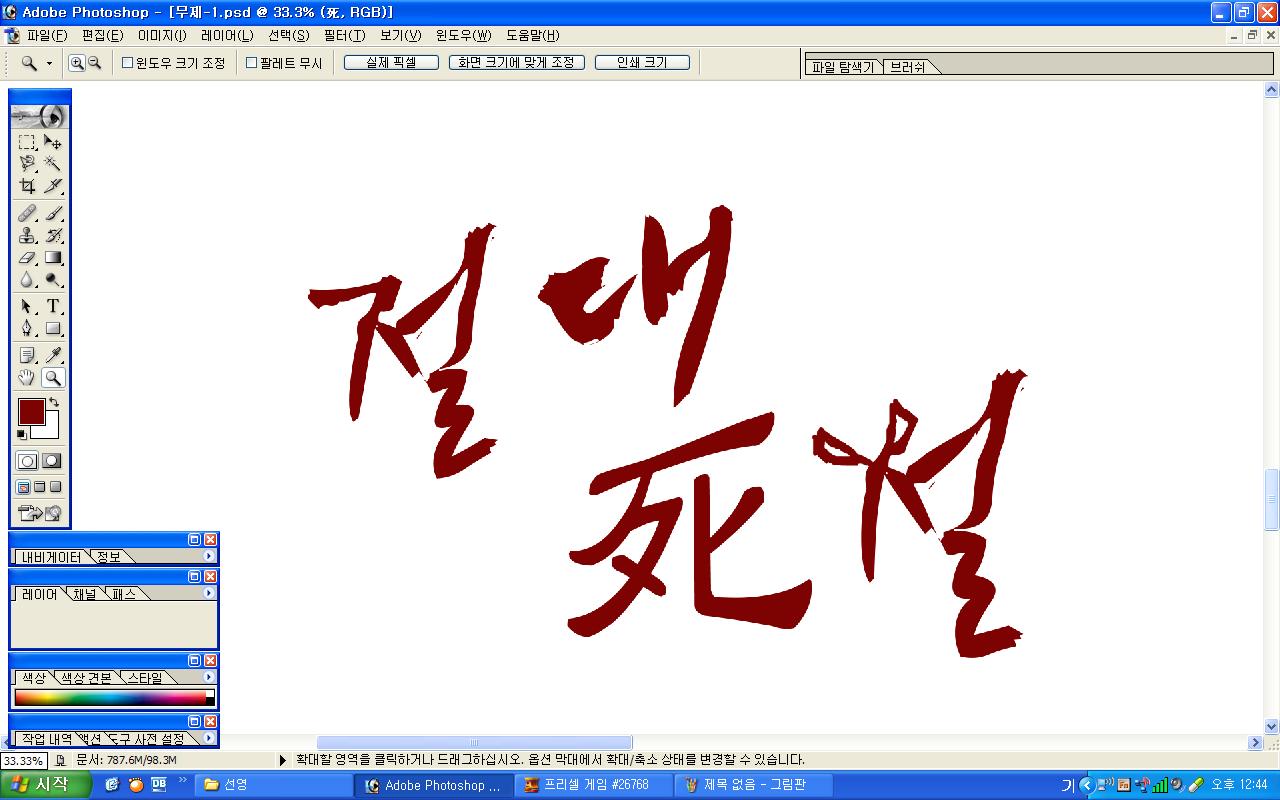 정중히 캘리 부탁드립니다. -_- 류재철 일반 0 5903 2009.11.16 11:18 실력자 분들이 많이 계셔서 이렇게 염치없게 부탁드립니다. - 절대死절 : 첨부한 파일 참고해주시면 감사하겠습니다.(약간 거친느낌? ^^;;) : '절'자의 ㅈ은 가위로...^^;; : 포스터 제작용이라 ai 파일이 필요합니다. 대학동아리 연극공연 포스터로 쓸 예정입니다. 비상업적인 공연이라 이렇게 부탁드립니다.